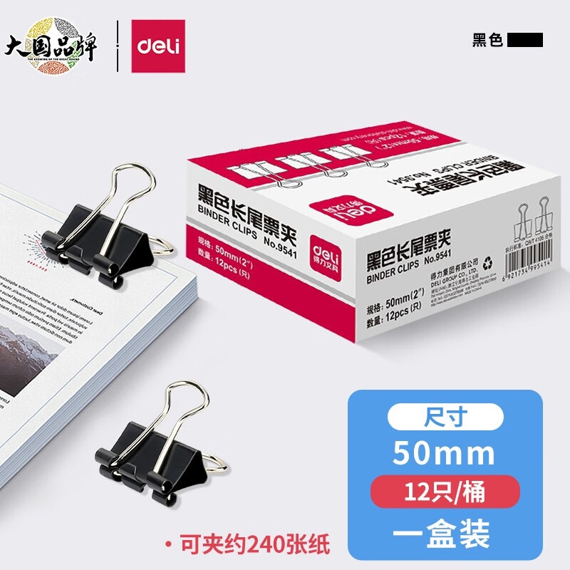 | 商品名称 | 得力(deli)金属夹票夹黑色长尾夹票据夹燕尾夹12只装办公用品 50mm 9541 一盒 |